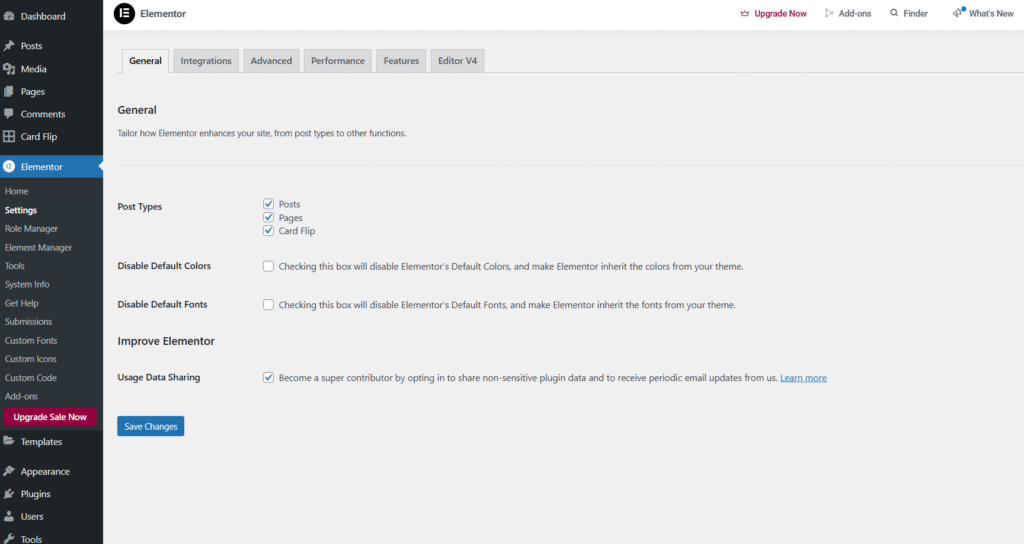 - After activating Plugin, go to elementor settings and enable post type called card flip.