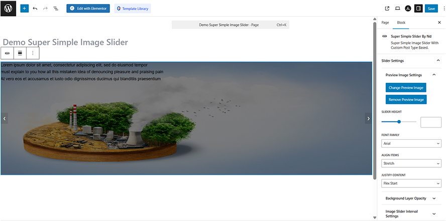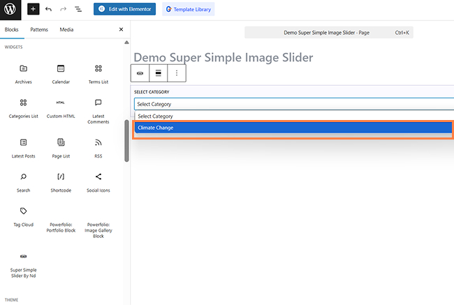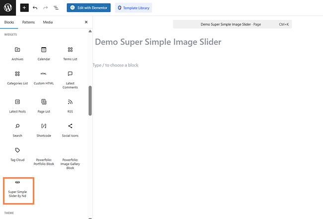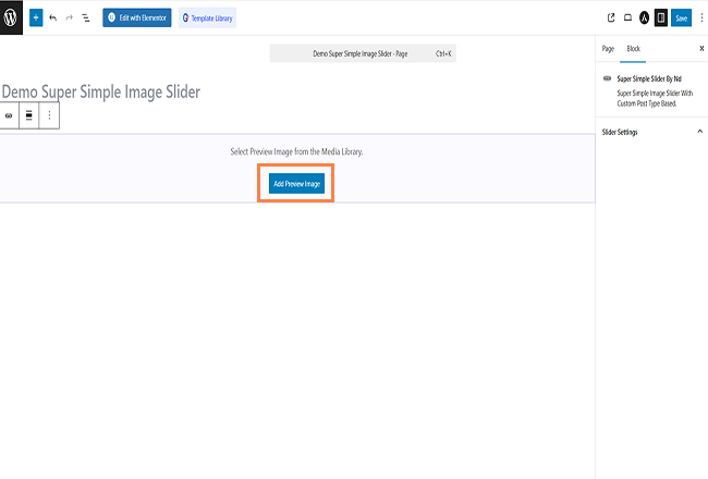 3. open or add new page. then open Gutenberg editor. search super simple image slider in widget section and add it to wherever you want.