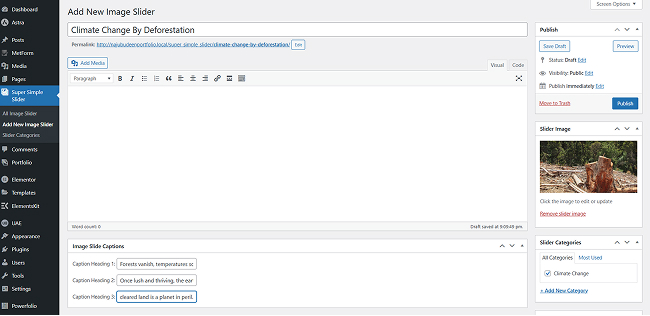 2. Go to Super Simple Slider Menu in admin dashboard and Click on Add new Image Slider. add image and category ( Adding category for each slider is mandatory )for the slider.